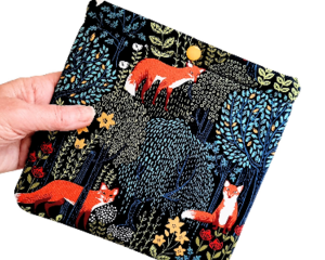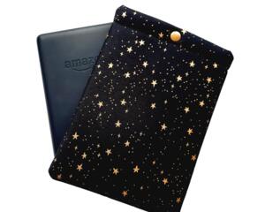 A pouch with a snap closure to protect Kindle e-readers made with black with gold metallic stars fabric.